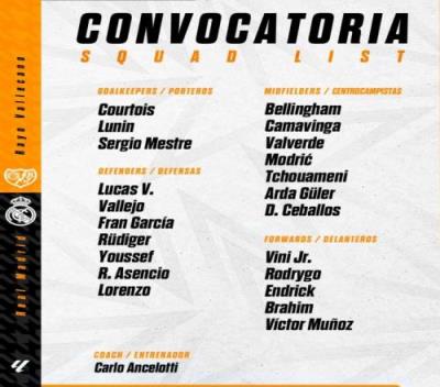 皇马战巴列卡诺大名单:维尼修斯领衔锋线,姆巴佩缺席