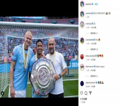 他也通过社媒晒出了自己和哈兰德、瓜帅一起手持夺冠奖盘的照片,并配文道:“感谢上帝。”