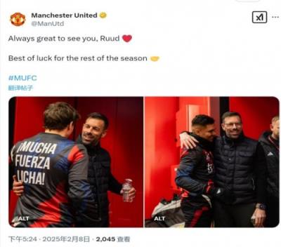 曼联官方社媒晒出范尼的照片,配文:“很高兴见到你,鲁德。祝你本赛季剩余的比赛好运。”
