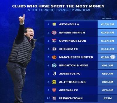 体育资讯8月1日报道宣称 《转会市场》统计了今夏各俱乐部支出情况,将在新赛季重返欧冠的阿斯顿维拉居首。