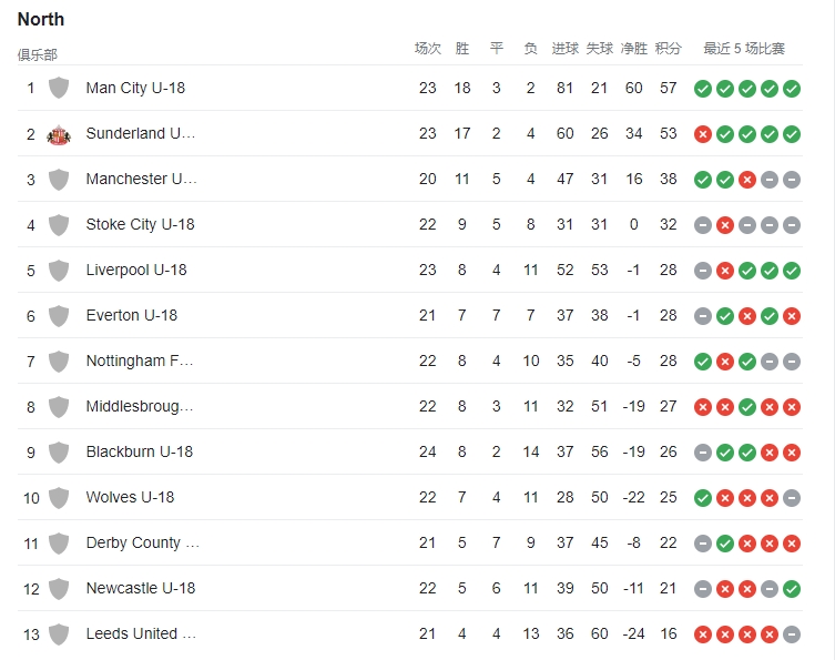 PL U18北区积分榜: