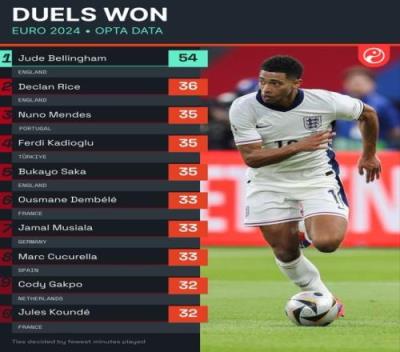 断层第1!欧洲杯对抗成功数排行:贝林厄姆54次居首,赖斯36次第2