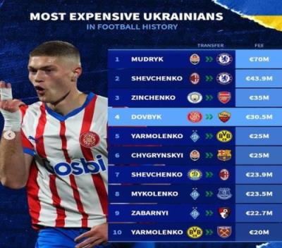 乌克兰球员历史转会榜:穆德里克7千万欧居首,舍瓦、津琴科在列