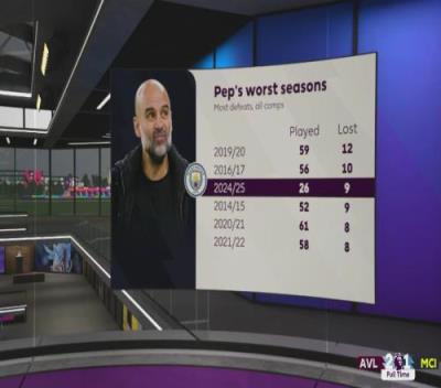 本赛季的战绩在瓜迪奥拉的职业生涯中前所未有,天空体育列出了瓜迪奥拉最差赛季数据,输球场次最多的是在2019/20赛季,59场输了12场,而本赛季曼城在踢完26场比赛之后就输了9场。
