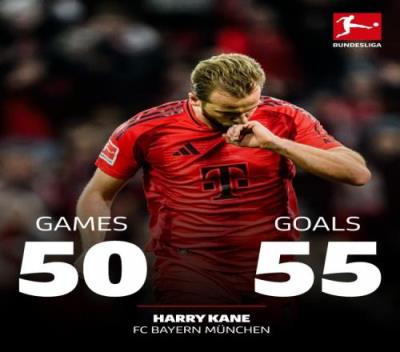 德甲官方数据统计显示,凯恩自加盟拜仁以来出战了拜仁54场德甲中的50场,打进55球并助攻16次。他也刷新了哈兰德在多特时期创造的德甲50场50球纪录。