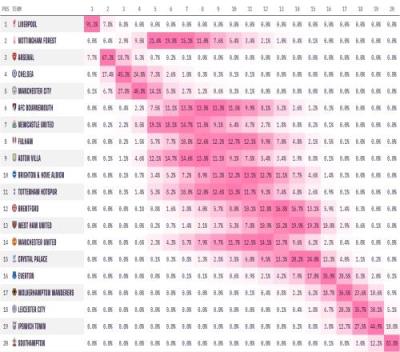 其他球队方面,机构认为阿森纳目前夺冠概率为7.7%,切尔西0.9%,曼城仍有0.1%,包括目前排第二的诺丁汉森林在内的其他球队,夺冠概率均为0。