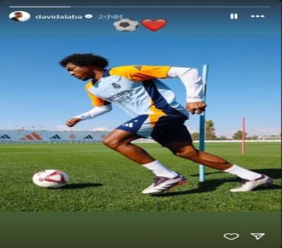 皇马官方确认阿拉巴已经恢复有球训练,他在社交媒体上晒出自己训练的照片,并附上足球和红心的表情符号。