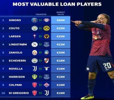 德转列当前外租身价榜:西蒙斯8000万欧领跑,扬库托、扎鸟在列