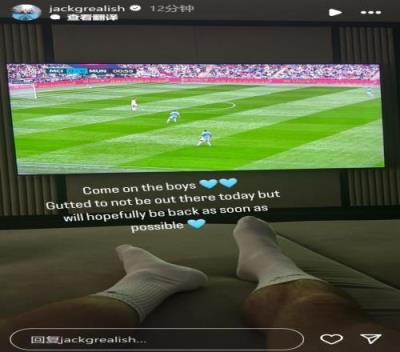 格拉利什晒出一张自己在家看球的照片,配文写道:“加油,伙计们!非常遗憾今天不能去现场,但是我希望可以尽快回归。”