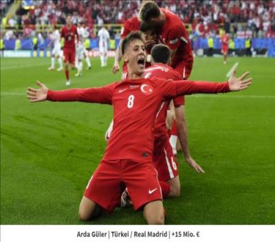 体育资讯07月18日报道宣称 德转欧洲杯特别更新出炉,土耳其新星居勒尔身价暴涨1500万欧至4500万欧。