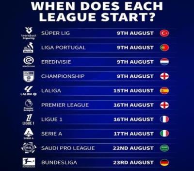 体育资讯8月10日报道宣 《转会市场》统计了各大联赛新赛季开始时间,主流联赛中德甲回归最晚。