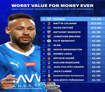 体育资讯1月29日报道宣称 德转列出球员场均出场花费排行,内马尔场均花费1280万欧居首,埃基蒂克、拉维亚榜上有名。