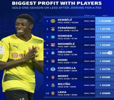 体育资讯8月7日报道宣 《转会市场》统计了足坛历史在支付转会费签下球员后,又在一年内转售的盈利情况,多特在登贝莱身上净赚1亿欧。
