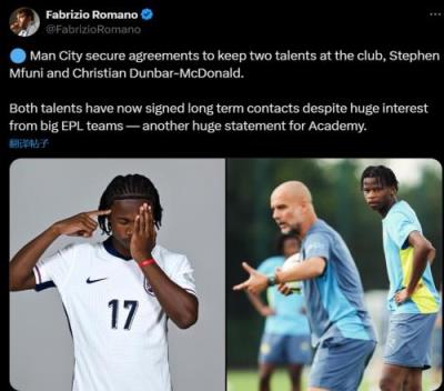 重视青训!罗马诺:曼城与16岁小将姆富尼和麦克唐纳签下长约