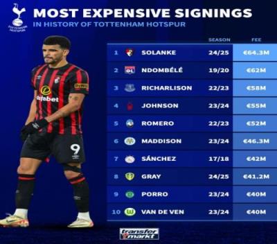 热刺队史新援转会费榜:索兰克6430万欧居首,理查利森在列