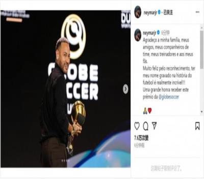 内马尔在社交媒体上晒出领奖的照片,并写道:“我要感谢我的家人、朋友、队友、教练和球迷。”