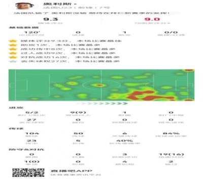 体育资讯8月10日报道宣 法国在奥运决赛3-5加时不敌西班牙,本场出任前腰的奥利斯数据如下: