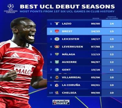 体育资讯12月13日报道宣称 德国转会市场统计了欧冠改制以来新军首秀赛季前6场的积分,并列出榜单,本赛季布雷斯特前6场拿到13分,仅次于1999-2000赛季拉齐奥。