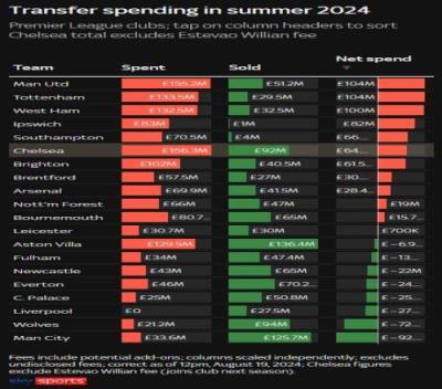 英超现转会净支出排行:曼联热刺1.04亿镑领跑,曼城净挣9210万镑