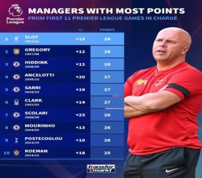 教练英超生涯前11场积分榜:斯洛特28分居首,安帅27分&穆帅26分