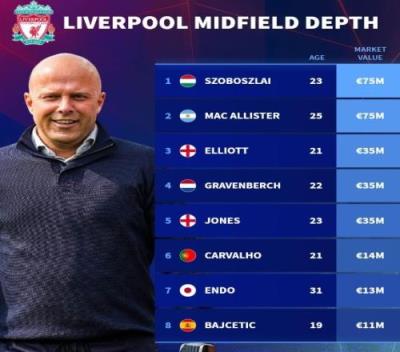 德转列利物浦中场阵容深度及身价:欧元