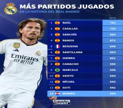 莫德里奇出场次数排名皇马队史第13位,有望进入前10