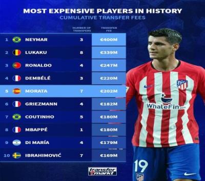 足坛累计转会费榜:内马尔4亿欧居首,卢卡库8次转会3.39亿欧第二