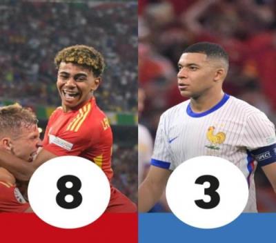 体育资讯7月10日报道宣称 欧洲杯半决赛,西班牙2-1逆转法国晋级决赛,姆巴佩送助攻,亚马尔世界波。赛后,队报打分本场比赛,亚马尔8分,姆巴佩3分。