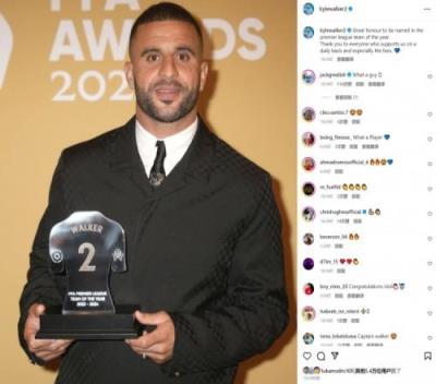 体育资讯8月22日报道宣 PFA公布球员票选年度最佳阵,曼城后卫沃克入选。沃克在社媒上发文感谢。