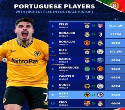 德转列葡萄牙球员转会费榜:菲利克斯压C罗居首,内托、菲戈在列