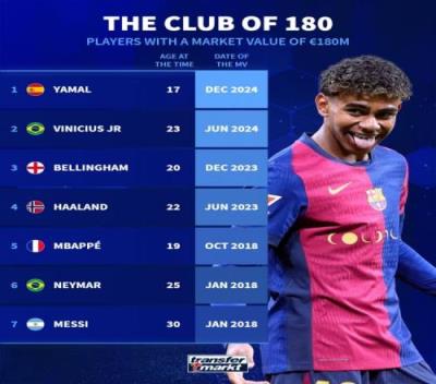 体育资讯1月4日报道宣称 德国转会市场盘点了身价曾达到1.8亿欧的球员,梅西、姆巴佩、亚马尔在列。