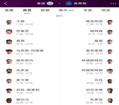 曼城替补:33-卡森、80-布里茨、68-阿莱恩、66-普西、17-德布劳内、19-京多安、75-奥赖利、87-麦卡蒂、67-穆巴马