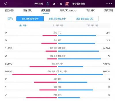 热刺vs利物浦数据:控球相当,射门924、射正512、得分机会29