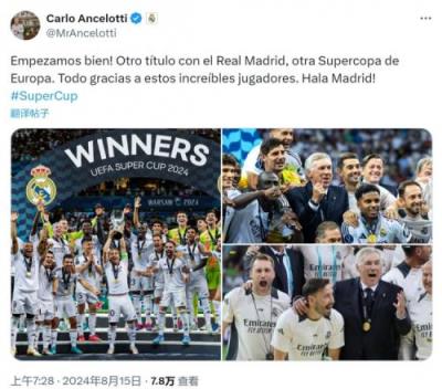 安切洛蒂在社交媒体上晒出球队捧杯的照片,并写道:“我们有了一个好的开始!随皇马再次夺冠,又一次捧起欧超杯奖杯。”