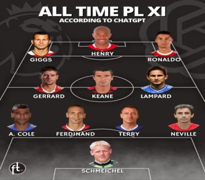 ChatGPT评选的英超历史最佳阵容包括舒梅切尔、阿什利-科尔、费迪南德、特里、加里-内维尔、杰拉德、罗伊-基恩、兰帕德、吉格斯、亨利和C罗,但不少球迷对此不买账。