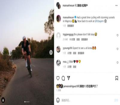 拜仁门将诺伊尔在西班牙马略卡岛度假,他在社媒晒出自己骑车的照片,同时配文:“在马略卡岛骑自行车,欣赏美丽的日落,现在要回到拜仁开始工作。”