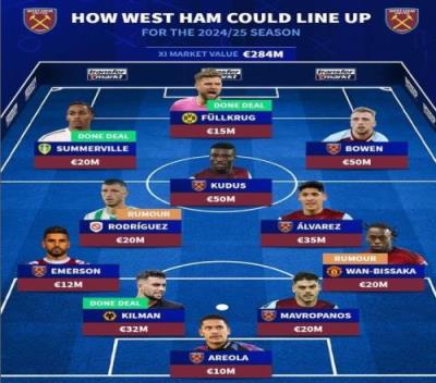 德转预测西汉姆新赛季首发:总身价2.84亿欧元