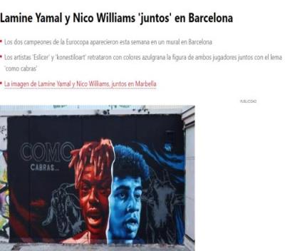 体育资讯7月29日报道宣称 西班牙《每日体育报》报道,艺术家为亚马尔和尼科-威廉姆斯在巴塞罗那绘制了同框壁画。