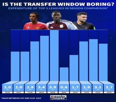 体育资讯8月3日报道宣称 今夏的转会市场稍显平淡,甚至被部分媒体认为是“史上最无聊夏窗”。不过《转会市场》对比近10年数据,显示今年同期成交额位列中游。