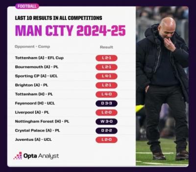 断崖下滑!曼城近10场比赛输掉7场,与此前105场输球场次一样多