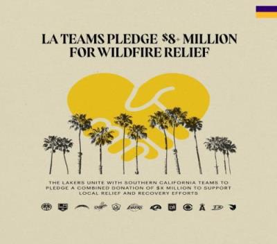 体育资讯1月14日报道宣称 今日洛杉矶12支职业体育俱乐部联合发表声明,将共同捐赠超800万美元,用以支持灭火及帮助洛杉矶的山火受灾群众。