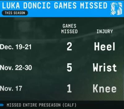 东契奇本赛季至今已缺席8场比赛,分别是脚后跟(2场)、手腕(5场)、膝盖(1场)。(此外他还因小腿伤势缺席了整个季前赛)
