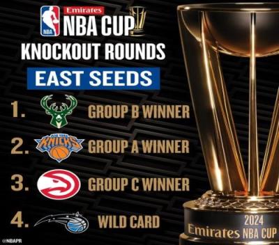 体育资讯12月04日报道宣称 NBA杯东部赛区,尼克斯、雄鹿、老鹰与魔术(外卡)晋级淘汰赛。