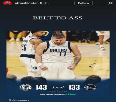 赛后,PJ-华盛顿更新个人社交媒体,晒出一张东契奇的庆祝照片,并配文道:“打屁屁咯。”