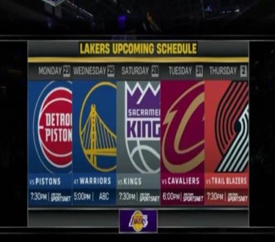 近5场比赛湖人取得了4场胜利,接下来5场比赛湖人将分别对阵活塞、勇士、国王、骑士和开拓者。
