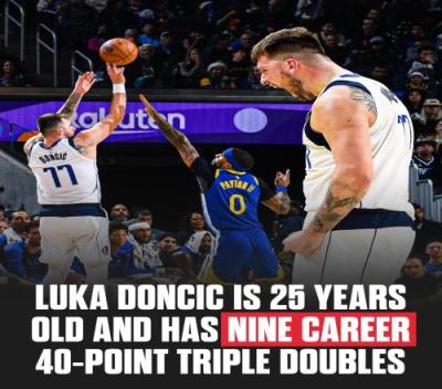 这是东契奇NBA生涯第9次单场40+三双,排名历史第四,前三分别是“大O”奥斯卡-罗伯特森(22次)、哈登(16次)、威少(13次)。