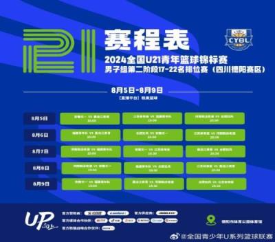 8月4日-9日,2024年全国U21青年篮球锦标赛男子组第二阶段17-22名排位赛将在四川德阳赛区进行。赛事采用单循环赛制进行,每队每天进行一场比赛。