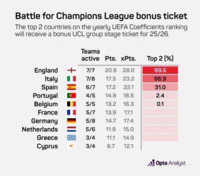 OPTA统计下赛季欧冠额外名额概率(共2个额外名额):