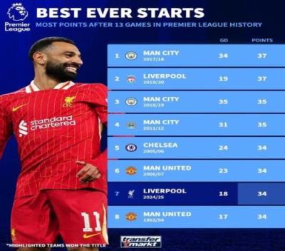 体育资讯12月3日报道宣称 英超13轮比赛之后,领头羊利物浦拿到34个积分,以9分的优势领跑积分榜。根据数据统计,英超时代前13轮拿到34+积分的球队最终都斩获联赛冠军。