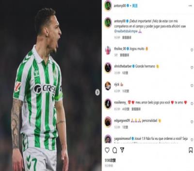 体育资讯2月3日报道宣称 贝蒂斯在本轮西甲2-2战平毕巴,从曼联租借而来新援安东尼首发出战并间接参与进球。